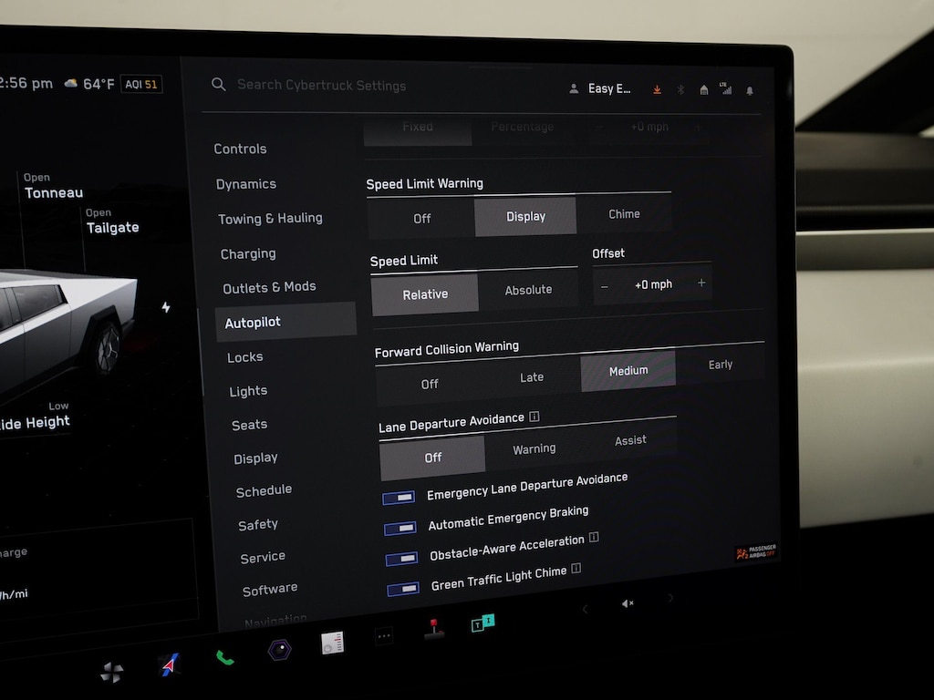 15 Speakers, 4-Wheel Disc Brakes, ABS brakes, Adaptive suspension, Alloy wheels, Audio memory, Auto High-beam Headlights, Auto-dimming door mirrors, Auto-leveling suspension, Axle Ratio: 15.02, Brake assist, Delay-off headlights, Dual front impact airbags, Exterior Parking Camera Rear, Four wheel independent suspension, Front Bucket Seats, Heated & Cooled Ventilated Front Bucket Seats, Heated door mirrors, Heated front seats, Heated rear seats, Heated steering wheel, Lane Departure Warning System, Memory seat, Navigation System, Perforated Vegan Leather Seat Trim, Power driver seat, Power passenger seat, Radio data system, Radio: Tesla Premium Audio System, Rear audio controls, Split folding rear seat, Variably intermittent wipers, Ventilated front seats, Wheels: 20" Core.